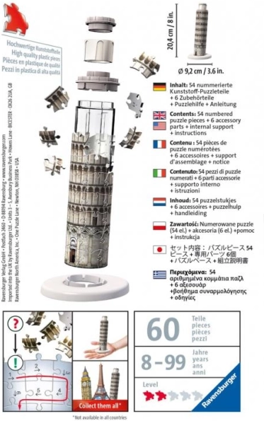 Ta 3D sestavljanka je idealna za dečke in dekleta, pomaga pri razvijanju njihovih reševalnih spretnosti ter izboljšuje potrpežljivost in pozornost do podrobnosti. Sestavljanka je zasnovana natančno in kakovostno ter ujame ikonični arhitekturni čudež Poševnega stolpa v Pisi v osupljivi 3D obliki. Sestavljanje posameznih koščkov za rekonstrukcijo tega slavnega orientirja prinaša občutek dosežka in vpogled v arhitekturne čudeže sveta. Naj bo kot samostojna dejavnost ali doživetje za vso družino in prijatelje, ta sestavljanka bo prinesla ure zabave ter košček bogate italijanske zgodovine in lepote v vaš dom.