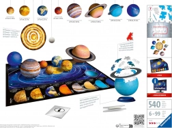 Z vrhunsko kakovostjo znamke RAVENSBURGER je sestavljanje tekoče, zabavno in poučno. Končane planete lahko obesite ali postavite na stojalo ter doma ustvarite efektni model vesolja. Priložen je tudi dvostranski plakat z informacijami (napisi v tujem jeziku) in slikovni priročnik za lahek začetek.