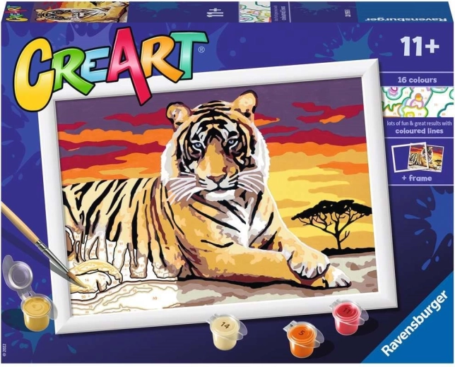 Pakiranje vključuje platno z oštevilčenimi območji, akrilne barve, čopič, stojalo in okvir.