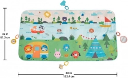 Podloga z merami približno 152 × 81 cm ponuja dovolj prostora za valjanje, čas na trebuščku in skupno igro s starši. Barvit kamping motiv spodbuja domišljijo in odkrivanje.