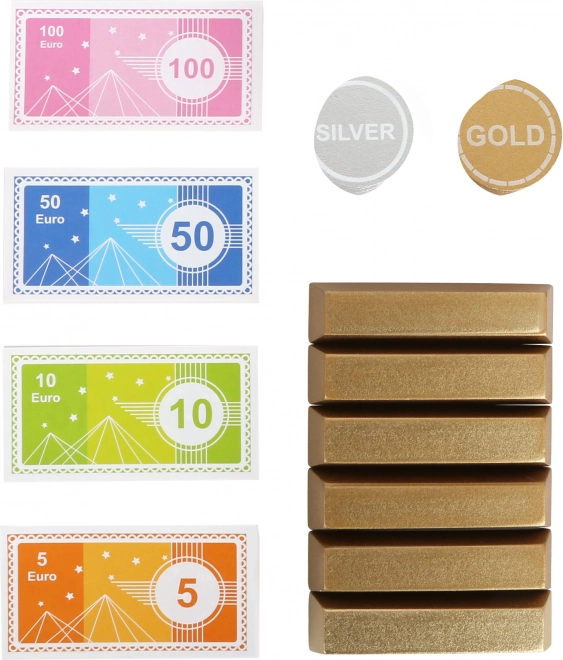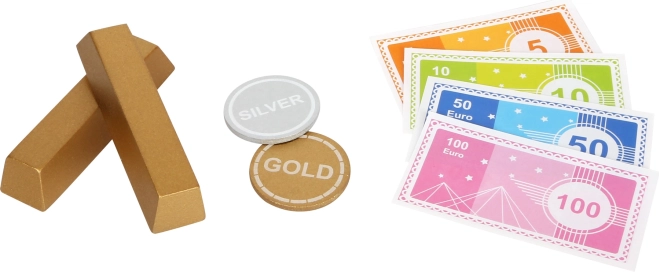 Vključuje evrske bankovce, zlate in srebrne kovance ter lesene zlate palice. Odlično za učenje vrednosti denarja, računanja in vloge bankirjev ter strank.