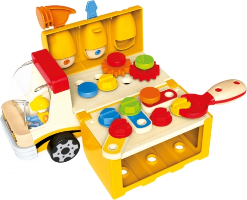 Robusten tovornjak združuje les in plastiko za dolgo življenjsko dobo in lahko upravljanje. Nagibna kesonska karoserija doda igri realistične elemente.