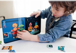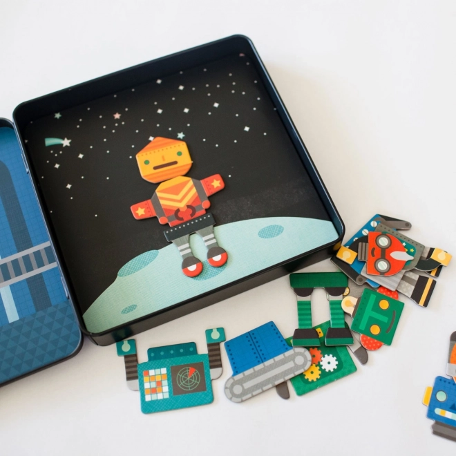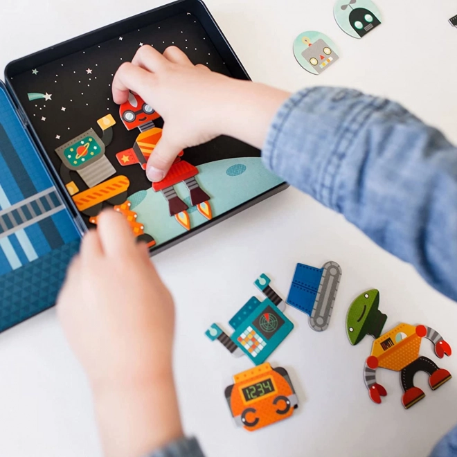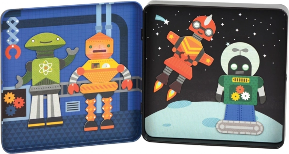 Magnetni komplet z roboti je odlična zabava za otroke od 3 let dalje. Zahvaljujoč več kot 25 magnetnim delom lahko mali konstruktorji sestavljajo neskončne kombinacije robotskih likov ter tako razvijajo domišljijo in ustvarjalnost. Kovinska škatlica se trdno zapira in v notranjosti skriva dva barvita prizora, na katera je mogoče dele zlahka pritrditi.