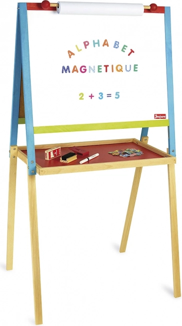 Podprite otroško ustvarjalnost s to stabilno leseno tablo 2 v 1. Ponuja črno površino za kredo in belo magnetno površino za flomastre, držalo za rolo papirja, velik odlagalni prostor ter bogat pribor. Izdelano v Franciji iz masivnega lesa z vodnim premazom – varna in trpežna rešitev za vsakodnevno ustvarjanje.