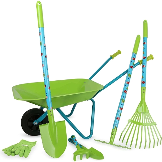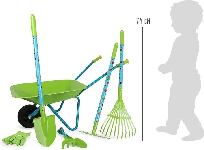 Ta velik otroški vrtnarski set SMALL FOOT prinaša vse, kar mali vrtnar potrebuje: stabilen samokolniček, lopato, grablje, grablje za listje, male grablje, lopatko in zaščitne rokavice. Večina delov je kovinskih, zato so čvrsti in trpežni, hkrati pa lahki in dobro vodljivi za otroške roke.