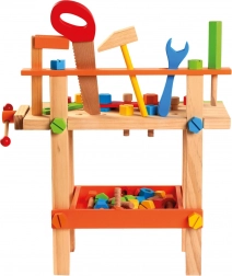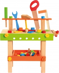 Vsebina: 9-delna miza s primežem, 5 kosov orodja in 36 gradbenih delov. Barvni vijaki, matice in spojke spodbujajo učenje barv in oblik ter tudi koordinacijo oko–roka. Shranjevalni prostori pomagajo ohranjati red in vodijo otroke k samostojnosti.