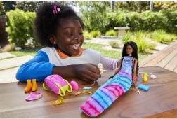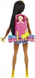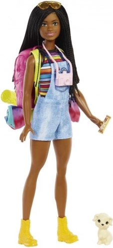 Set, navdihnjen s serijo BARBIE »It Takes Two«, prinaša realistične dodatke in privlačne detajle, ki podpirajo ustvarjalno pripovedovanje zgodb. Punčka ima sodoben outfit za v naravo – pruhovano majico, »jeans« hlače z naramnicami in rumene čevlje – ter je pripravljena na pustolovščine s svojim kužkom.