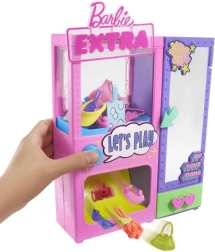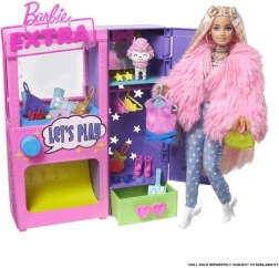 Odkrijte EKSTRA modno zabavo z igralnim setom Barbie Extra – stilsko garderobo in avtomatom za dodatke na “kremplje”. Pritisnite gumb in uživajte v presenečenju, katere dodatke boste dobili, nato pa jih kombinirajte v izvirne outfite za punčke Barbie (prodajajo se posebej). Set ponuja omarico z obešalniki, predal, ogledalo, prostor za ljubljenčka in kup trendovskih dodatkov – torbice, čevlje, nakit, očala ter stilskega kužka.