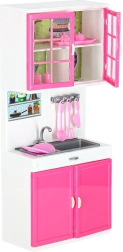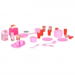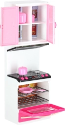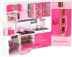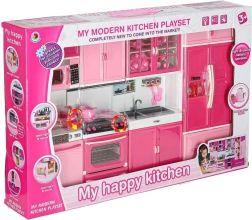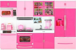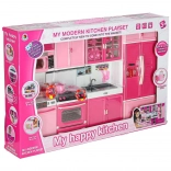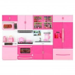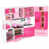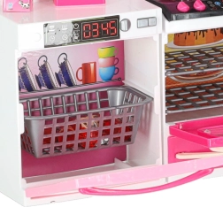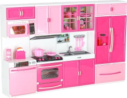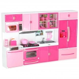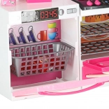 Set vključuje mikrovalovno pečico in pomivalni stroj, štedilnik s pečico, vitrino s koritom ter hladilnik s predalom. Otroci bodo uživali v celotnem scenariju kuhanja, peke in pospravljanja.