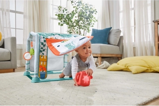 Ustvarite dojenčku varen, spodbuden prostor za vsakodnevno raziskovanje. Igralna podloga Fisher-Price 3v1 Hišica raziskovalca se zlahka prilagodi razvojni fazi otroka: od udobne igre na hrbtu z igračami nad glavico, preko krepitve vratnih in hrbtnih mišic med časom na trebuščku, do zabavnega tunela, ki motivira k plazenju in prvim poskusom kobacanja.