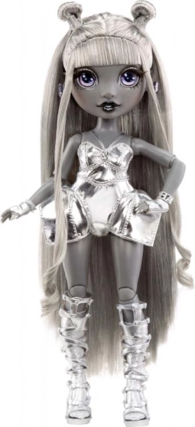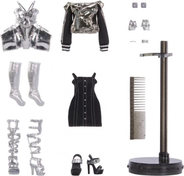 V kompletu je stilni outfit v odtenkih sive, črne in srebrne, dopolnjen s čevlji, nakitom in stojalom. Bogat nabor dodatkov podpira domiselno igro, mešanje stilov in zbirateljsko razstavljanje. Vstopite v rivalstvo šol RAINBOW HIGH in SHADOW HIGH ter ustvarite svoje modne scenarije.