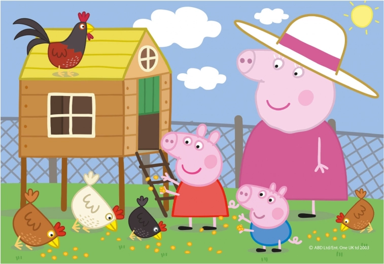 - Vesel motiv Peppa Pig s kokoškami motivira k sestavljanju