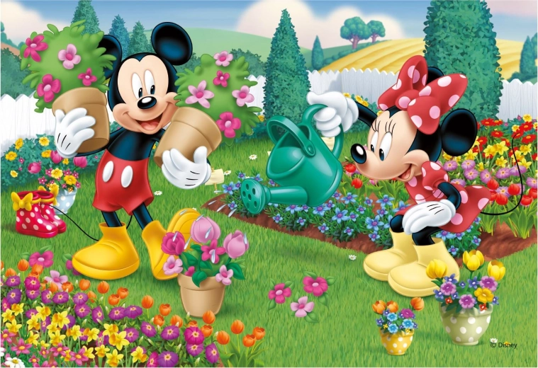Set ponuja 2 sestavljanki po 77 koščkov s priljubljenimi liki Minnie, Mickeyja in Daisy v veselih prizorih, polnih cvetja in ustvarjanja. Čvrsti koščki iz kakovostnega kartona dobro sedejo v roko in natančno prilegajo, zato so idealni za otroke, ki se učijo potrpežljivosti in spretnosti.