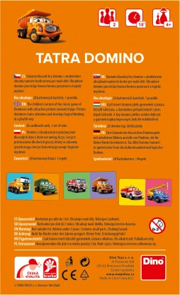 Priljubljene otroške domine z motivi čeških vozil TATRA prinašajo zabavo in učenje v enem. Vsebuje 28 trdnih kartic iz neškodljivega kartona, je lahka in idealna za na pot. Pri zlaganju otroci razvijajo pozornost in logično razmišljanje. Izdelano na Češkem, nosilec certifikata Varna in kakovostna igrača.