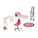 Notranje oblikovanje hišice v rožnato-beli barvni paleti vključuje pisalno mizo z prenosnikom, rožnat vrtljivi stol in posteljo z omarico. Balkon in ogledalo dodajata realistične podrobnosti.
