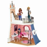 Hišica ponuja dvonadstropni prostor z malimi figuricami in dekoracijami, kot so postelja, miza in ogledalo. Zabava z domiselno igro je zagotovljena.