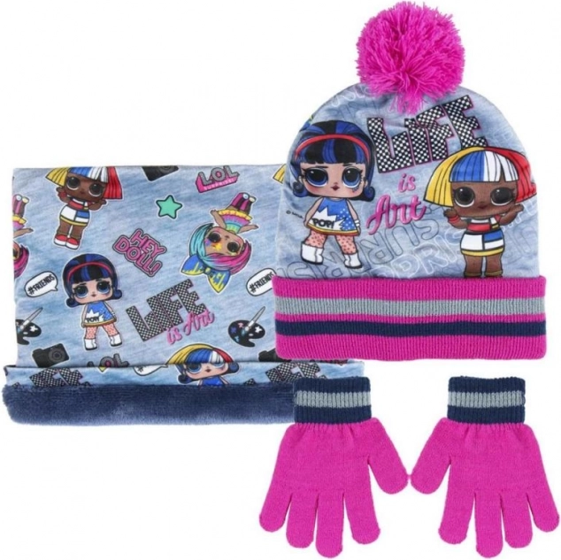 Zimski set L.O.L. za otroke: kapa, ovratnik in rokavice v univerzalni velikosti. Stajliš licenciran dizajn, udobje in toplina za otroke od 3 let.