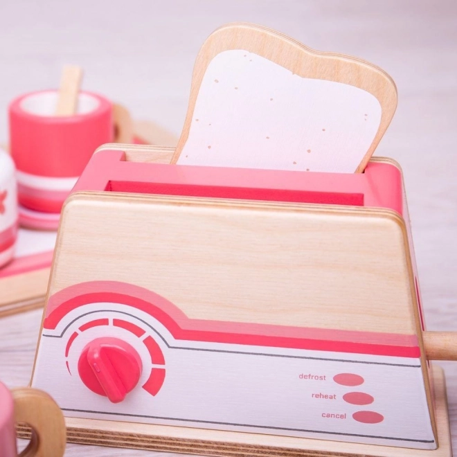 Lesen toaster Bigjigs Toys v prijetni rožnati kombinaciji prinese v otroško kuhinjico veliko veselja. Z vrtljivim gumbom in funkcionalno ročico otroci zlahka posnemajo pravo pečenje kruha, kar podpira posnemovalno igro, fino motoriko in domišljijo.
