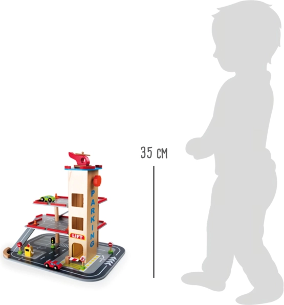 Zaradi vzdržljive lesene izdelave je igrača trajna in dolgotrajna. Dimenzije parkirišča so 35x48x38 cm in so primerne za otroke od 3 let dalje.