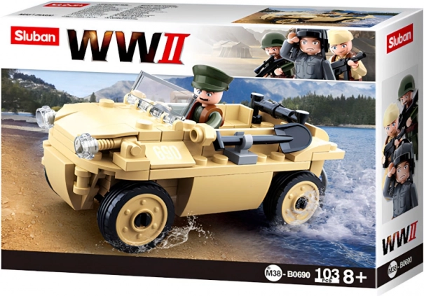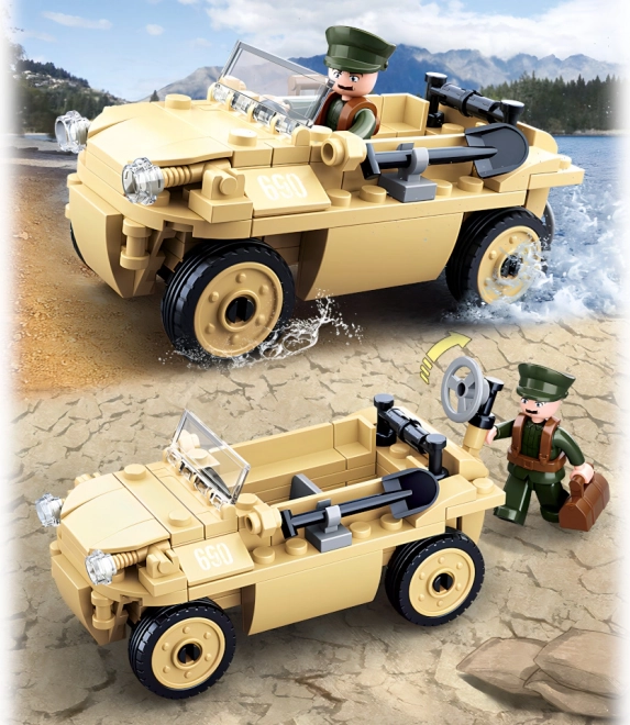Sestavljanka ponuja podrobno repliko nemškega amfibijskega vozila, obogateno z realističnimi elementi, kot sta vetrobransko steklo in premična kolesa.