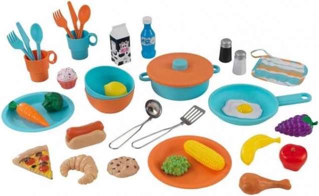 V paketu je 38 kosov posode, živil in kuhinjskih pripomočkov. Otroci lahko takoj postrežejo, mešajo, režejo in odkrivajo nove recepte.
