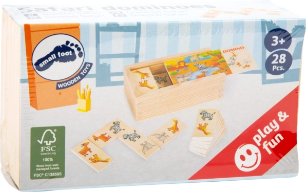 Kakovostni leseni domino z živalmi s safarija bo navdušil otroke od 3. leta naprej. Zaradi večjih delov je rokovanje enostavno, učenje pravil igre pa intuitivno in zabavno. Material s FSC certifikatom zagotavlja trajnosten izvor lesa in dolgo življenjsko dobo igrače.