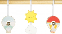 Ta stabilna in varna otroška stojna je izdelana iz visokokakovostnega lesa z mislijo na varnost otrok. Barvite igrače v obliki oblačka, gorovja in toplozračnih balonov so obešene na tekstilne vrvice in nežno cingljajo.