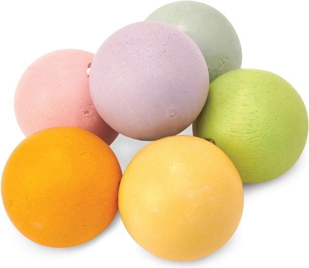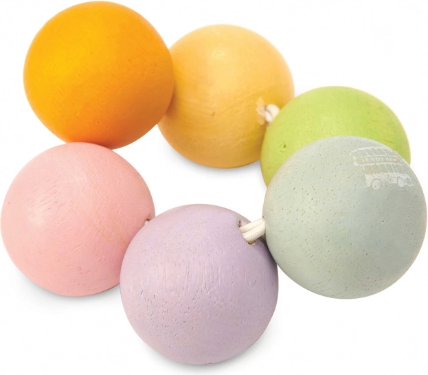Pastelne lesene kroglice na elastični gumici lepo sedejo v roko in pomagajo olajšati občutljive dlesni med izraščanjem zobkov.