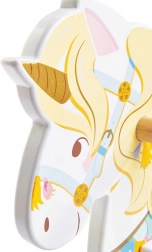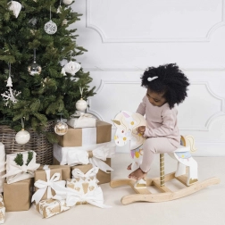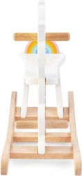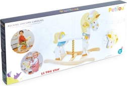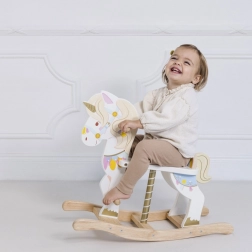 Gugalni samorog LE TOY VAN iz kolekcije Petilou je klasična igrača v sodobni preobleki. Zahvaljujoč čvrsti leseni osnovi in premišljeni ergonomiji podpira naravno guganje ter razvija koordinacijo, ravnotežje in samozavest v gibanju. Bogate barvne podrobnosti, zlati rog in prijazen izraz spodbujajo domišljijo in veselje do igre.