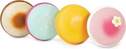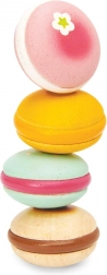 Štirje leseni makroni v nežnih barvah popestrijo vsako igro kavarne ali slaščičarne ter spodbujajo otroško domišljijo.