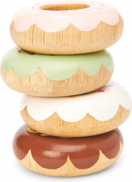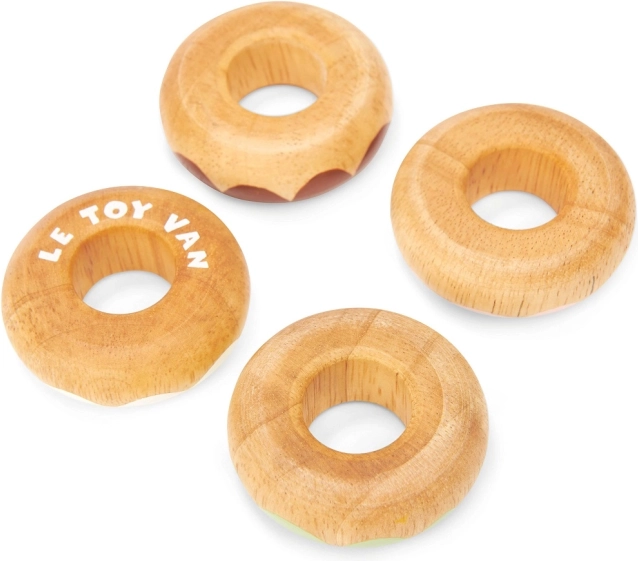 Ta komplet lesenih krofov Le Toy Van je ne le estetsko prijeten, temveč predvsem varen in izdelan iz masivnega lesa. Vsak krof je nežno zaobljen za varno igro in okrašen s pastelnimi odtenki z različnimi vzorci posipov. Vodne barve, uporabljene pri ročnem dodelovanju, so netoksične in popolnoma varne za otroke.
