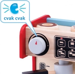 Kavni aparat ima realistične podrobnosti, kot sta odstranljiva ročka in gibljiv mlečni dozirnik, kar povečuje izkušnjo otroka med igro.