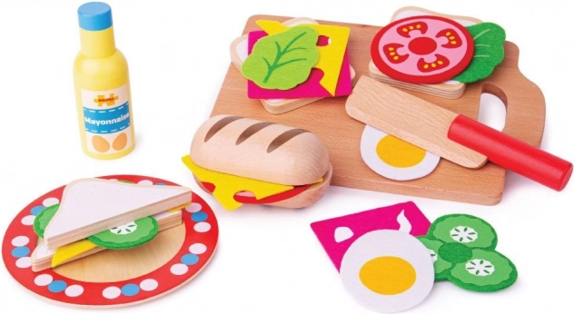 V kompletu najdete vse za pripravo okusnega sendviča: bageto, rezine kruha, majonezo, solato, kumaro, sir, jajce in paradižnik, dopolnjeno s krožnikom, rezalno desko in nožem. Materiali izvirajo iz odgovornih virov in igrača izpolnjuje evropske varnostne standarde, zato ji lahko zaupate.