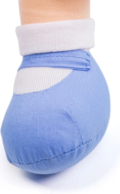 Amelia je mehka tekstilna punčka z rjavimi kitami iz preje, modro‑belimi črtastimi oblekicami in prijaznim nasmehom. Zasnovana je za varno cartanje od prvih dni, spodbuja razvoj fine motorike in empatije ter je odlična za prve igre skrbi.
