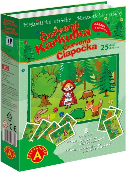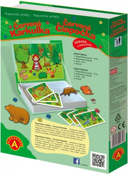 Magnetna igra Alexander – Rdeča kapica: 25 delov, 8 predlog, knjiga s tablo. Razvija motoriko, domišljijo in govor. Idealna za dom in za na pot.