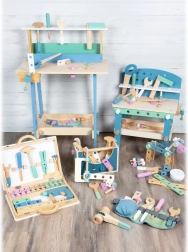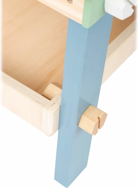 V kompletu je 21 delov: 5 vijakov, 5 matic, 3 žeblji, 5 kosov orodja in 3 perforirane ploščice za vadbo vijačenja in zabijanja. Ne manjkajo primež in spodnja polica za varno shranjevanje vseh dodatkov. Odlična izbira za dečke in deklice od 3 let dalje.