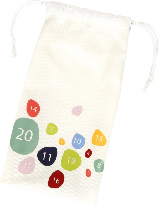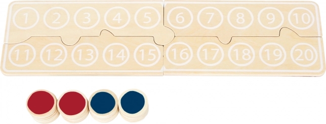 Barvni žetoni in pregledna tabla s številkami 1–20 omogočajo otrokom enostavno sestavljanje primerov in opazovanje rezultatov pred očmi.