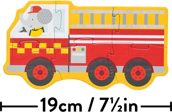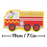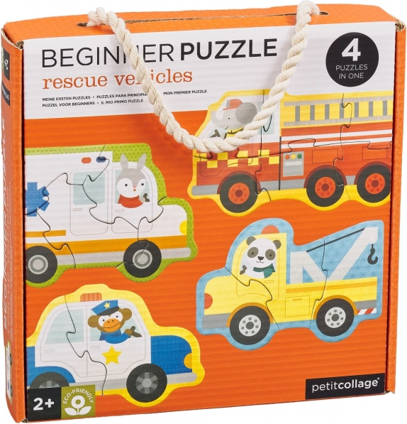 Simpatične ilustracije otrokom približajo svet reševalcev – zajec vozi reševalno vozilo, opica policijski avto, slon gasilski tovornjak, panda pa vlečno vozilo. Različna težavnost sestavljank (3, 4, 5 in 6 kosov) spodbuja postopen razvoj veščin, potrpežljivost in veselje ob uspehu.
