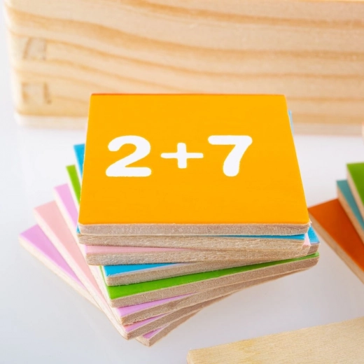 - Pisani leseni koščki za seštevanje in odštevanje števil 1–9, shranjeni v škatlici