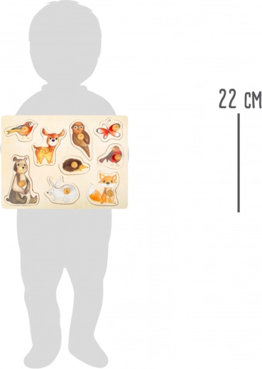 Lesena vstavljanka small foot Gozdne živalice z 9 koščki in bunkicami za lahek prijem. Razvija fino motoriko in potrpežljivost. Primerno od 12 mesecev.