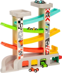 Steza je zasnovana za razvoj veščin posnemovalne igre in fine motorike, medtem ko se otroci dirkajo s štirimi raznobarvnimi avtomobilčki. Poleg tega lahko mali dirkači zahvaljujoč praktičnemu sistemu parkiranja in shranjevanja svoje avtomobilčke po dirki preprosto pospravijo.