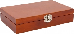 Trdna lesena škatla s kovinsko zaponko ščiti karte in kocke. Zlahka gre v nahrbtnik ali kovček.