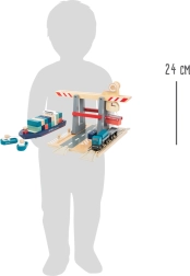 Ta premišljeni pristaniški gradbeni set otrokom prinaša realistično logistično igro: ladja z dvema vlačilcema je pripravljena na izplutje, medtem ko žerjav pretovarja barvite zabojnike z integriranimi magneti. Robustni leseni deli in gladko delujoči elementi podpirajo fino motoriko, domišljijo in potrpežljivost.