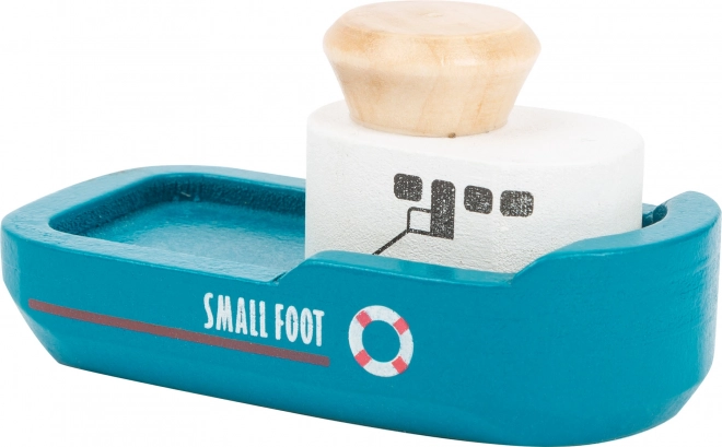 Modra ladja z barvnimi zabojniki in dva vlačilca, povezana z vrvico, prinašajo realistično igro morske plovbe.