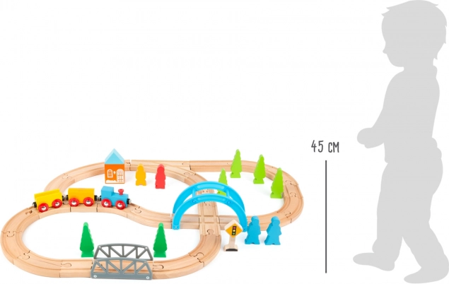 Komplet vključuje lokomotivo z vagoni, most, hišico, drevesa, figurice in prometne elemente za realistične scenarije. Naraven les v kombinaciji z izrazitimi barvami deluje privlačno in podpira senzorično zaznavanje. Zaradi združljivosti z drugimi lesenimi sistemi lahko otroci zlahka širijo svet tirov.