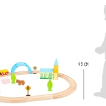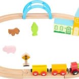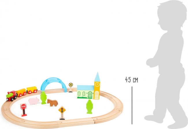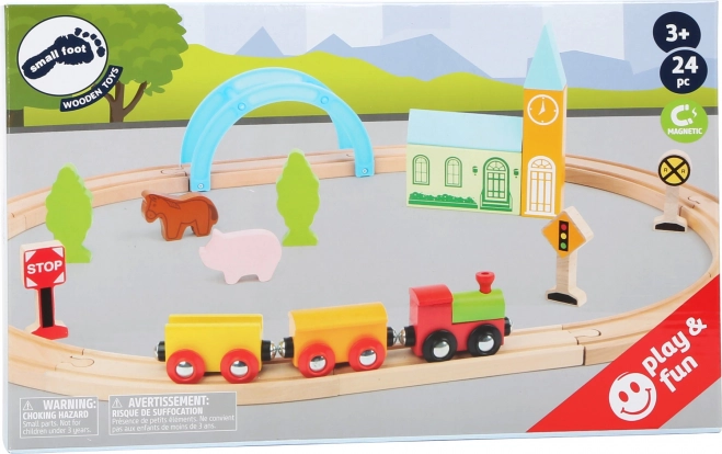 Ustvarite otrokom železniško idilo v sobi. Ta kakovostna lesena vlakovna proga SMALL FOOT se hitro sestavi, odlično drži in zahvaljujoč premišljenim dodatkom prinaša nešteto zgodb – od mirnega podeželja do živahnega mesta. Vlak pelje preko modrega mostu, gre mimo dreves, živali in prometnih znakov ter pri vsaki vožnji razvija domišljijo.