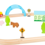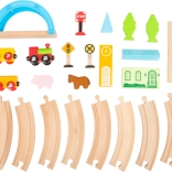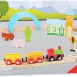 Set vsebuje 24 delov, vključno z magnetnim vlakcem z vagoni, zaskočenimi lesenimi tiri in barvnimi dekoracijami. Odporno leseno izvedbo je prijetno držati, je varno in idealno za male roke. Igra naravno razvija fino motoriko, ročno‑vidno koordinacijo in učenje pravil v prometu.