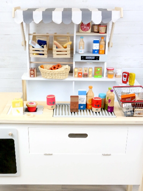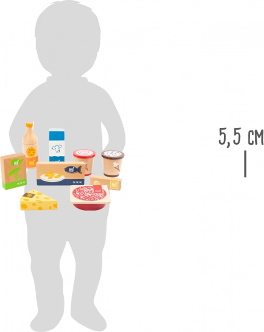Set vsebuje pomarančni sok, dve embalaži sladoleda, embalažo graha, ribje palčke, maslo, sir, narezan salama in škatlo mleka. Realistični potiski in naraven videz navdušijo na prvi pogled. Zahvaljujoč trdnemu lesu je set trpežen in pripravljen za vsakodnevno igro.