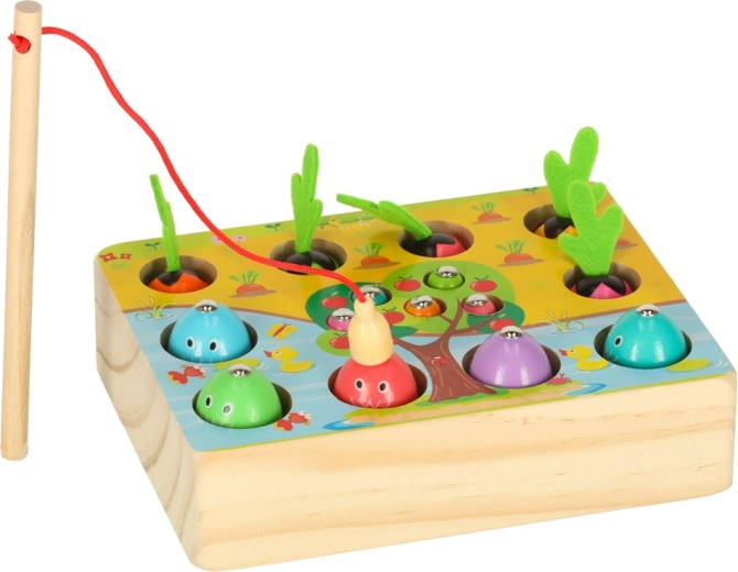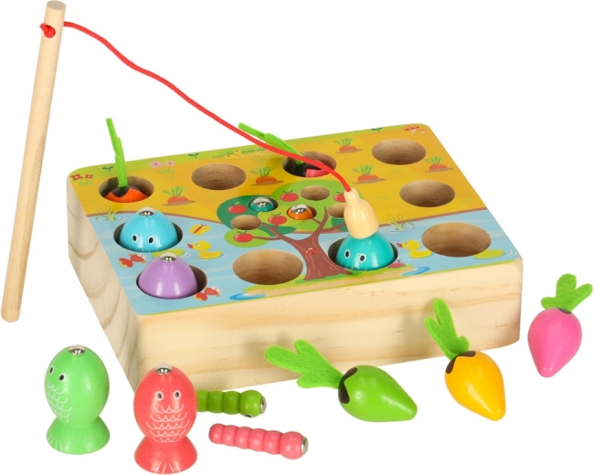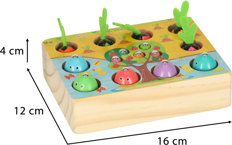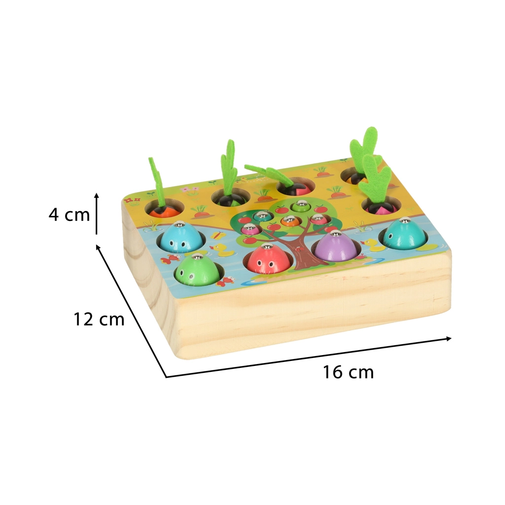 Ta večfunkcijski leseni komplet otroke popelje tako k ribniku kot na vrt – kar doma. Z magnetno palico bodo mali ribiči lovili ribice in črvičke iz pripravljenih odprtin, medtem ko male vrtnarje čaka pobiranje pisanih korenčkov za mehke filcaste lističe. Igra naravno razvija zbranost, natančnost gibov in uči otroke razlikovati barve.