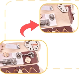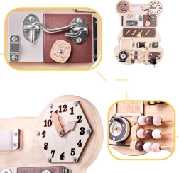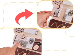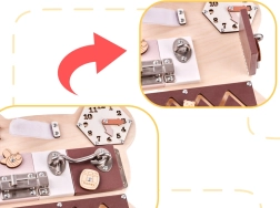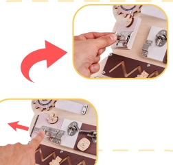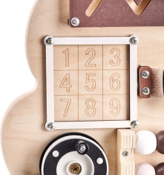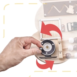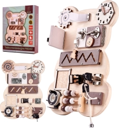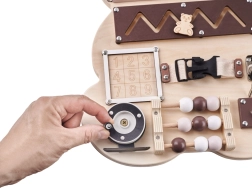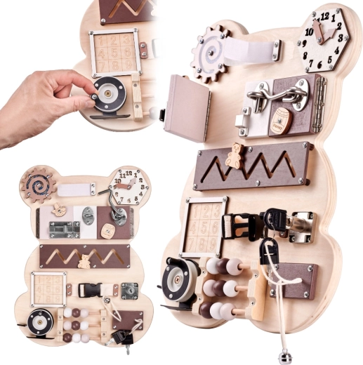 Da bi senzorična deska pritegnila otrokovo pozornost in ga spodbudila k igri, ima tabla obliko prikupnega medvedka in uporabljene barve so prijetne in privlačne za oči! Na deski je veliko elementov od najpreprostejših dejavnosti, kot je premikanje kroglic na števcu, do bolj zapletenih, kot je odpiranje ključavnice s ključem!